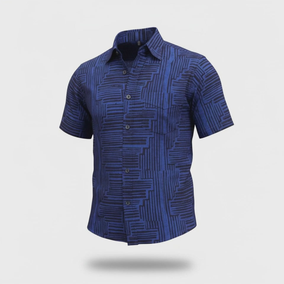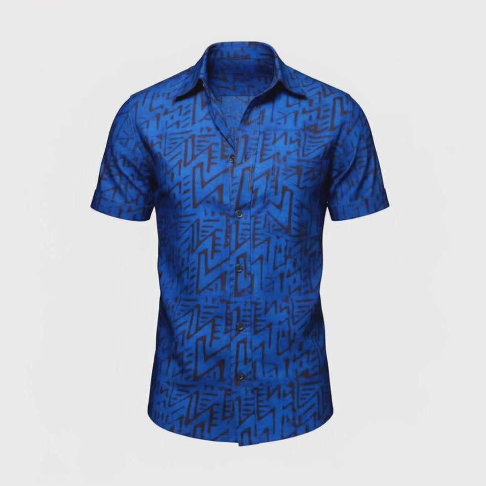 Each shirt is individually wax-printed, dyed, and stitched by Ghanaian artisans — no two ever the same. The indigo patterns tell a story of power reclaimed — of men who build, create, and redefine what luxury looks like when made in Africa.